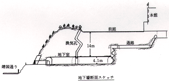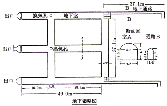 昭和16〜17年に、近衛工兵および民間の奉仕隊によって、露天掘り+埋め戻し(オープンカット)方式によって、建造された。7000m上空から投下された1トン爆弾にも耐え得る構造とするため、鉄筋により補強されたコンクリート構造(厚さ4mともいう)設計になっている。地下壕の平面、断面図は下記スケッチの通りであるが、この中に、戦時中は作戦本部として常時200名程度が業務に就いていたが、これが空襲時には3000名が退避したともいわれる。したがって、強制換気装置(入気および排気)が設備されているが、地上における取入れ口が通風燈籠となってカモフラージュされているのが興味深かった。