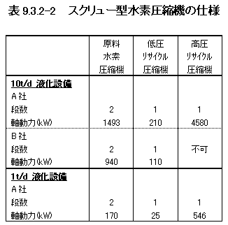 9.3 水素液化設備の概念設計 9.3.1 研究開発目標 本年度は自動車用水素ステーションの少容量液化機の予備検討として、液化コスト低減に重要な水素圧縮機の仕様検討を行う。第T期の大型液化設備と同様に水素圧縮機の高効率化を狙い、遠心ターボ型を適用した場合の仕様を検討し、従来の少容量液化機に使用される容積型圧縮機と性能、寸法、コストの比較を行う。また、遠心ターボ型圧縮機と容積型圧縮機を組み合わせたハイブリッド型圧縮機の検討を行い、その可能性を調査する。 9.3.2 平成12年度の研究開発成果 9.3.2.1 小容量水素液化機の仕様検討 水素自動車用ステーションとして想定される少容量水素液化機の製造能力を選定した。第I期のサブタスク7の検討結果では、ステーションでの充填量はバス1台で500Nm3、自家用車1台で50Nm3程度であり、液化容量は300Nm3/h(0.65t/d)が必要となる。そこで、昨年度は水素ステーション15〜45ヶ所程度に相当する10t/d、30t/dとして、容積型圧縮機を用いた液化機の検討を行った。 本年度は昨年度と同様に10t/d、30t/dの液化機と、更に少容量である水素ステーション1基相当の1t/dの液化機に関し、水素圧縮機の検討を行うこととした。水素液化プロセスは図9.3.2-1に示すように、第T期の300t/d大型水素液化設備にも選定した水素クロードサイクルとし、流量を水素液化量の比率で減らし、圧力、温度条件は同じと仮定した。 9.3.2.2 水素圧縮機の仕様検討 (1) 遠心ターボ型圧縮機の適用検討 これより、30t/d水素液化機の原料水素圧縮機は段数が35段、羽根車径が317mm〜70mm、低圧リサイクル圧縮機は段数が15段、羽根車径は158mm〜72mm、高圧リサイクル圧縮機は段数が25段、羽根車径は320mm〜123mmとなる。 所要動力は原料水素圧縮機が2,056kW、低圧リサイクル圧縮機が274kW、高圧リサイクル圧縮機が5,343kWと推定される。10t/d水素液化機では原料水素圧縮機の段数が35段、羽根車径が183〜41mm、低圧リサイクル圧縮機は段数が15段、羽根車径は91mm〜42mm、高圧リサイクル圧縮機は段数が25段、羽根車径は185mm〜71mm となる。所要動力は原料圧縮機が696kW、低圧リサイクル圧縮機が92kW、高圧リサイクル圧縮機が1,817kW と推定される。また、1 t/d水素液化機では最終段が20mm以下と小さくなり、後述するターボ・スクリューハイブリッド型かスクリュー型が現実的と思われる。 (2) 容積型圧縮機の仕様検討 (3) 遠心ターボ型圧縮機と容積型圧縮機の比較 スクリュー型圧縮機は油分離システム等の付帯設備が多く、設置面積が大きいと思われる。遠心ターボ型圧縮機のコストはスクリュー型水素圧縮機に対し、原料水素圧縮機で約3.3倍、リサイクル圧縮機で約1.8倍高くなる。遠心ターボ型圧縮機とスクリュー型圧縮機の初期投資の差額は854百万円となる。但し、遠心ターボ型圧縮機では圧縮機動力を約59%、3,678kW低減できるため、年間稼働時間を2000時間とし、電気代を20円/kWhと仮定すると、約6年で初期投資を回収できる。 9.3.2.3 ハイブリッド型圧縮機の検討 (1) 仕様検討 表9.3.2-3に10t/d液化機用のターボ・スクリューハイブリッド形圧縮機の仕様を示す。原料水素圧縮機に関しては、遠心ターボ型の場合35段、スクリュー型では2段必要であるが、ハイブリッド型では遠心ターボ型12段とスクリュー型1段とした。全体の圧力比27.3を、遠心ターボ型で3.47、スクリュー型で7.79と配分した。これより、遠心ターボ型に比べ、大幅に段数を低減でき、羽根車径は10t/d液化機で183mm〜108mmとなり、実現可能な大きさとなる。また、スクリュー型も2段を1段に低減できるため小型化が可能になる。低圧リサイクル圧縮機では遠心ターボ部分を6段、高圧リサイクル圧縮機では12段とし、それぞれ1段のスクリュー型圧縮機と組み合わせた。 (2) 性能・寸法・コスト比較 9.3.3 今後の進め方および課題 今後は少容量液化機の実現に向けて、高効率液化設備を設計するためのデータ整備を進める必要がある。具体的には、来年度から水素膨張タービンの設計技術の整備に着手し、さらには高性能水素圧縮機を実現する上で必要な要素技術である、シールや軸受の性能、耐久性などの設計データの取得を図るよう計画する。