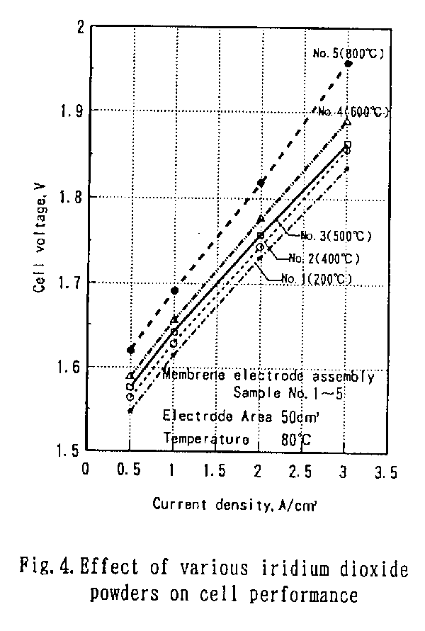 Fig.4.Effect of various iridium dioxide powders on cell performance